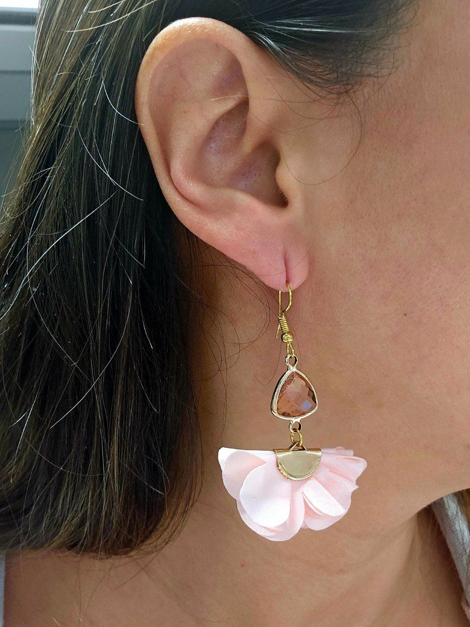 Très élégantes, ces boucles d’oreilles colorées sont assorties d’une breloque en verre cristal et d'une fleur en tissu.