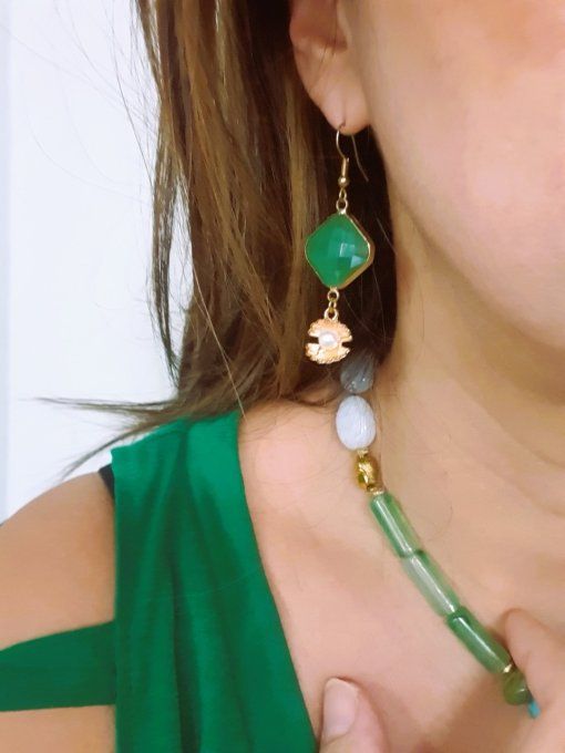- de boucles d’oreilles assorties de perles en verre de Murano couleur vert jade et d’une breloque en émail doré en forme de coquillage