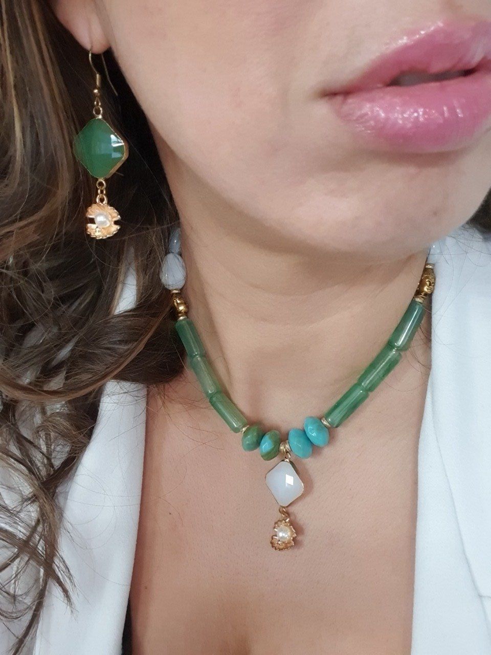 - d’un collier assorti de perles de pierre acryliques blanche et vert jade, de perles de têtes de bouddha dorées, d’une perle en verre de Murano blanche et d’une breloque en émail doré en forme de coquillage
